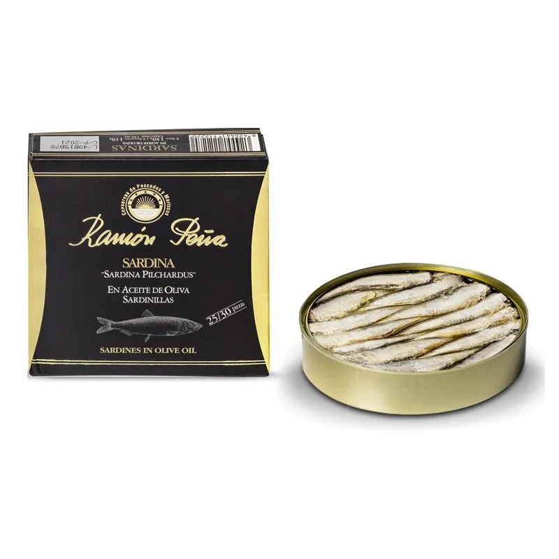 Catturate all’alba all’interno della rìa de Arousa durante i mesi tra luglio e agosto, le sardine di Ramon Peña vengono elaborate manualmente ma con delicatezza per la loro piccola dimensione. Massima attenzione viene dedicata alle sardine per l’intero processo della filiera: dalla loro selezione e pulizia, fino all’esposizione alla griglia e al confezionamento manuale. Possiedono una consistenza delicata e morbida, con una carne vellutata e saporita, come conseguenza dei metodi di pesca che fanno sì che le sardine non subiscano compressioni o scosse.